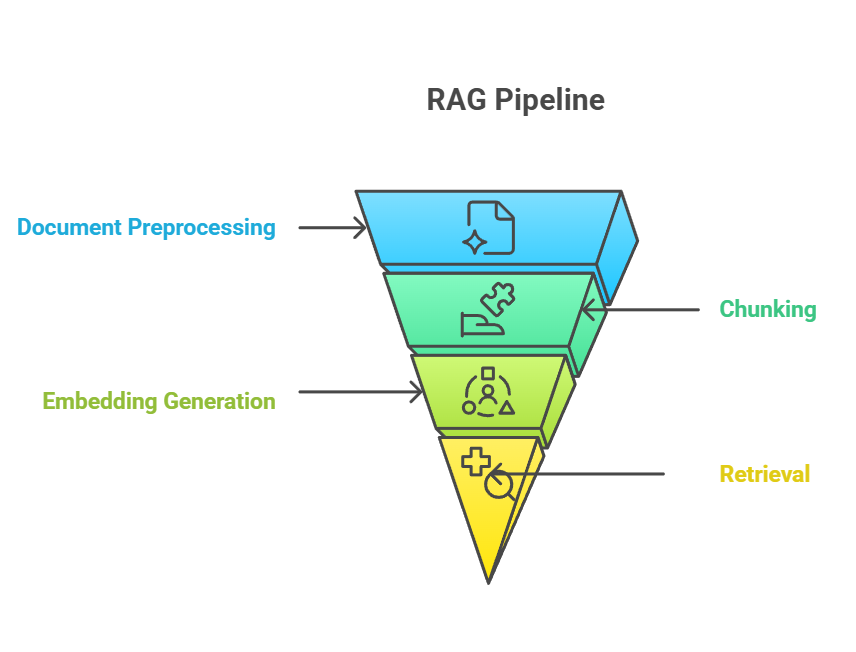 Le chunking occupe une position essentielle dans le pipeline RAG, servant de pont entre l'ingestion de documents bruts et la récupération de connaissances significatives. Dans le pipeline RAG de bout en bout, le découpage en morceaux se produit généralement après le prétraitement des documents, mais avant la génération d'intégration. Le processus de segmentation alimente directement l'étape d'intégration, au cours de laquelle chaque segment est converti en représentations vectorielles qui capturent la signification sémantique.altPipeline RAG d'alt