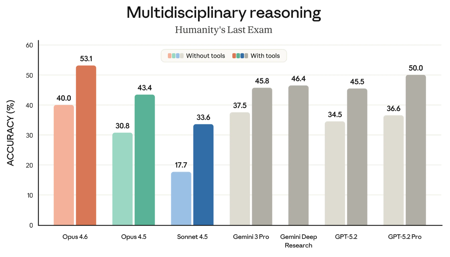 This graph might be better as two graphs. That minor point aside, the takeaway is clear: Opus 4.6 is the leader in both the ‘with tools’ and ‘without tools’ categories.