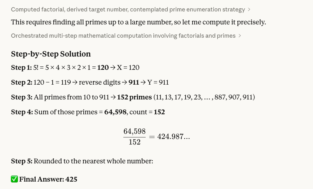 Here's how we verified 425 as the correct answer: 5! = 120; subtract 1 to get 119; reverse the digits to get 911. Then, using some R code (shown below), we could see that there are 152 primes between 10 and 911, and their sum is 64,598. Finally, using R again, we divide and round: 64,598 ÷ 152 ≈ 425.