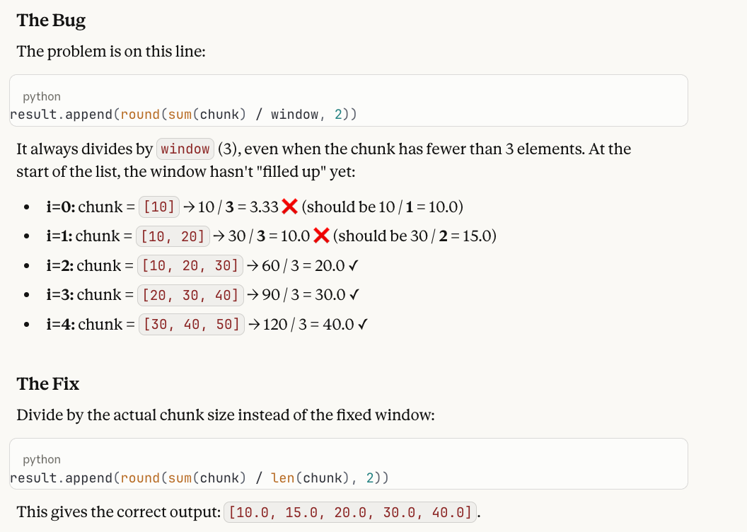 Here's the answer and why it works as a test: the function always divides by window (3), even when the chunk has fewer than 3 elements at the start of the list. The buggy output is [3.33, 10.0, 20.0, 30.0, 40.0], but the first two values should be 10.0 and 15.0 since those chunks contain only 1 and 2 elements, respectively. The fix is changing / window to / len(chunk).