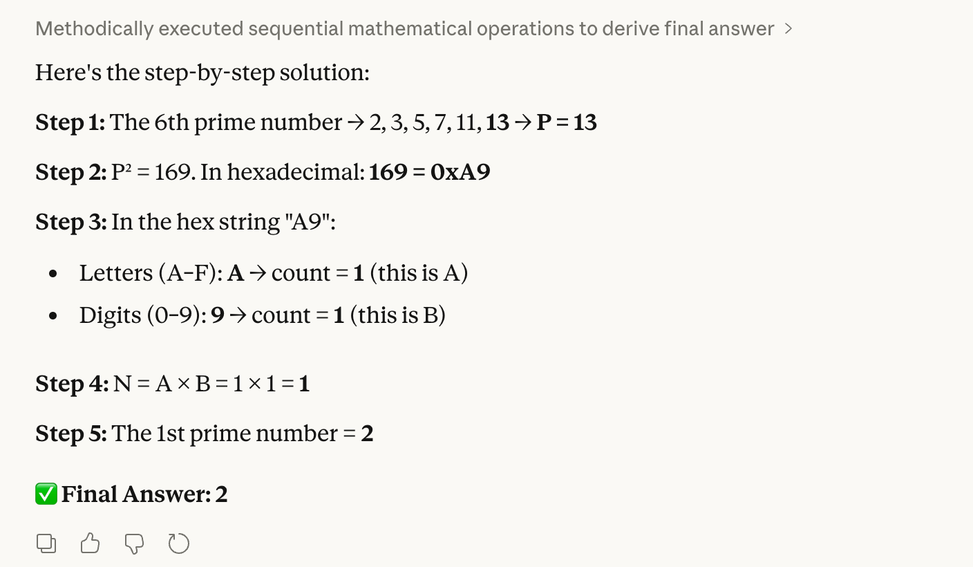 The worry is that a model could trip up with hex conversion, which would cascade into a completely wrong final answer. As you can see, Opus 4.6 had no trouble: