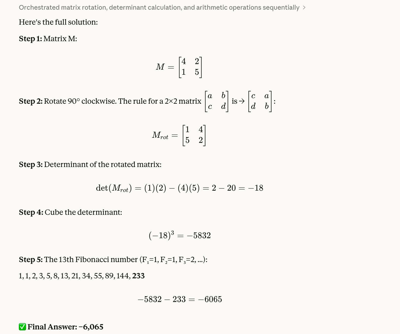 We had liked the idea of this test because we know from experience that models often swap matrix elements incorrectly or else they lose the negative sign partway through. Again, Opus 4.6 had no trouble: