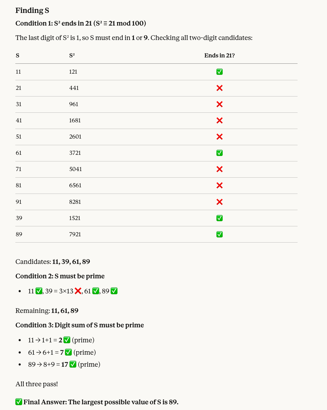 Here's why the correct number is 89: Numbers whose squares end in 21 include 11, 39, 61, and 89. Of these, 39 isn't prime, so we're left with 11, 61, and 89. All three have digit sums that are prime (2, 7, and 17, respectively), so the largest is 89.