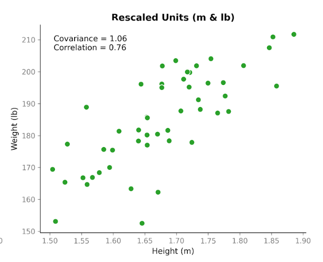 Now here’s where it gets interesting. Let’s take the exact same data and change the units. We’ll convert height from centimeters to meters, and weight from kilograms to pounds. The people haven’t changed. The relationship hasn’t changed. The pattern in the scatterplot looks the same. But when we recalculate the covariance, the number is different: 1.06. It’s still positive, but the magnitude is very different. And the only thing we changed was the units.
