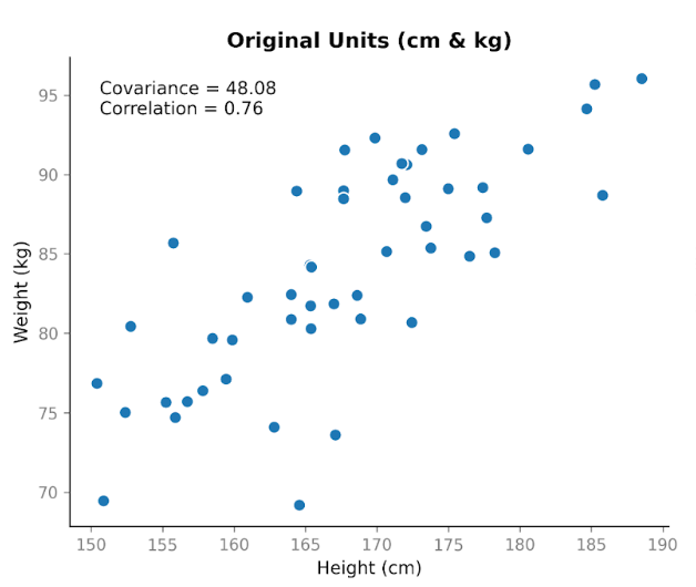 Unlike covariance, correlation adjusts for the variability in each variable before measuring the relationship between them. Because of that adjustment, the value does not change when we switch units. It focuses only on how tightly the points follow a linear pattern and whether that pattern slopes upward or downward.