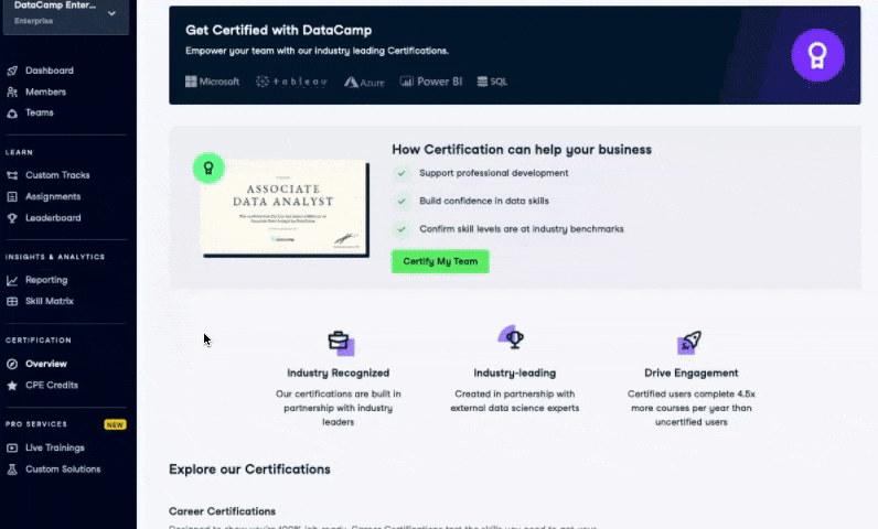 No need to find another CPE training provider! With your existing DataCamp plan, you can enable CPAs and other finance professionals in your organization to meet their ongoing CPE requirements, all in one place. To begin, head to the Certifications section in Group Hub and select CPE Credits.