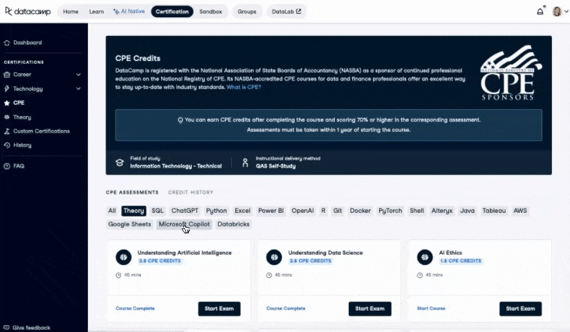 Visit Certifications in the DataCamp platform to explore our full range of CPE assessments and get started.
