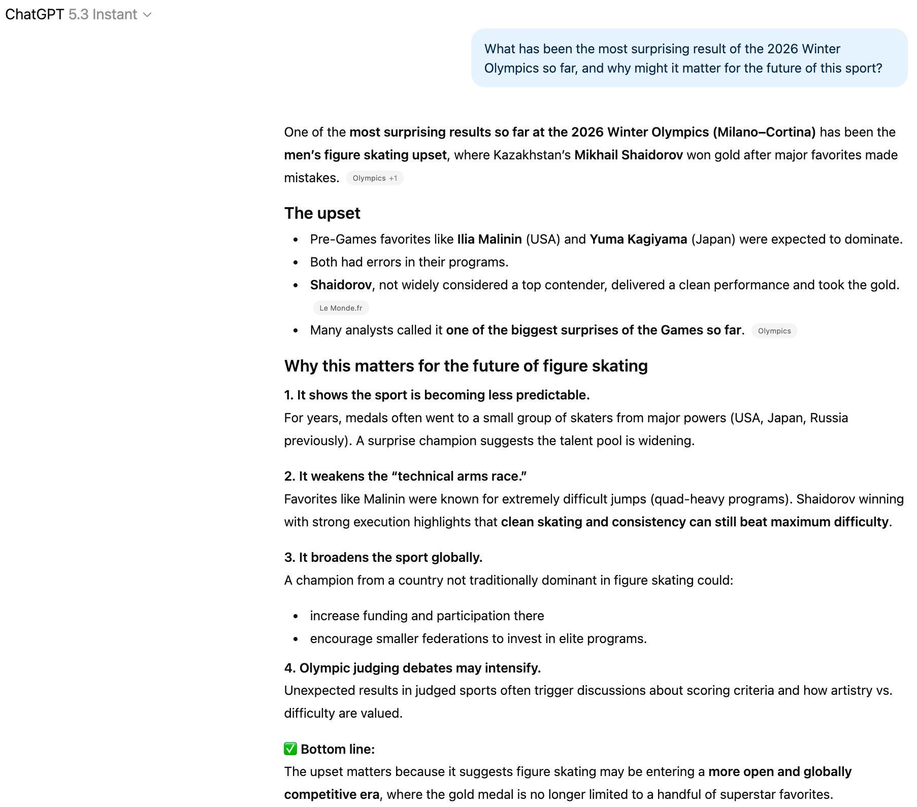 In a matter of seconds, GPT-5.3 Instant went through about 30 sources and cited two of them prominently in the response. All four reasons why the surprising result is important for the future of figure skating seem to be very relevant and supported by accurate claims: