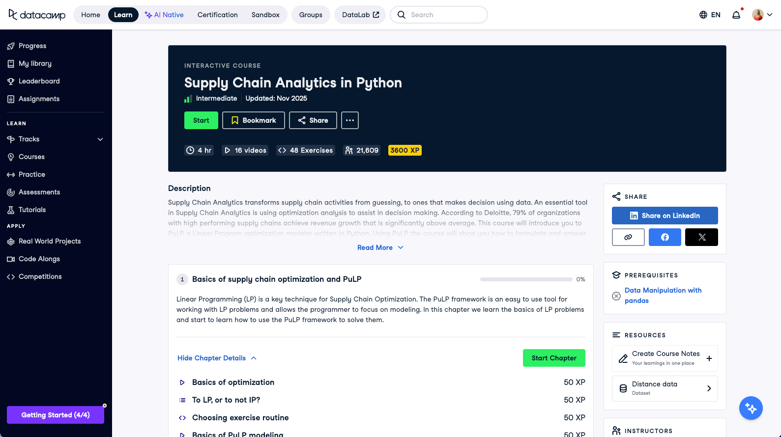 DataCamp moves teams from knowledge to application fast. Learners practice with real-world datasets and scenarios like demand forecasting, customer segmentation, and supply chain analytics, building skills they can apply immediately.