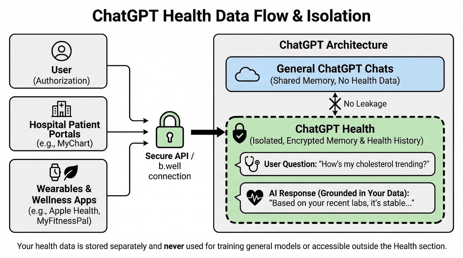 Wie chatGPT Health deine medizinischen Daten isoliert und verschlüsselt. Bild vom Autor.