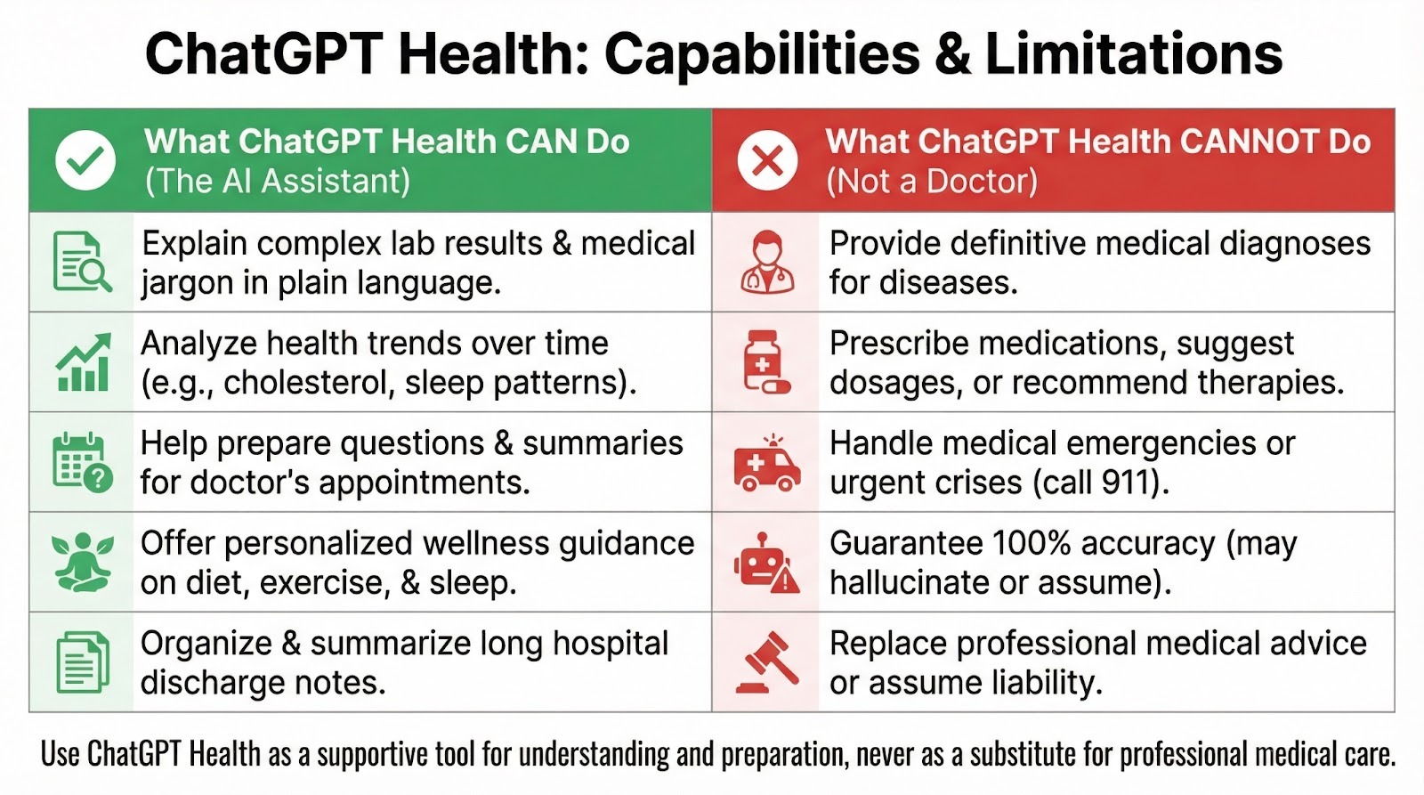 Nein, chatGPT Health kann und wird keine medizinischen Diagnosen stellen. Es ist extra dafür gemacht, deine Gesundheitsversorgung zu unterstützen, nicht sie zu ersetzen. Das Tool kann dabei helfen, Symptome zu erklären, Testergebnisse zu interpretieren und allgemeine Gesundheitsinfos zu geben, aber es hat keine FDA-Zulassung als Medizinprodukt und darf rechtlich gesehen keine klinischen Diagnosen stellen. Alle Fragen zur Diagnose solltest du immer an qualifizierte medizinische Fachkräfte richten.