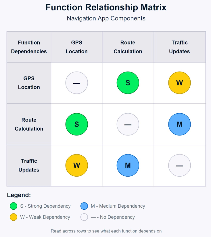 Funktionsbeziehungsmatrix, die die Abhängigkeiten von Navigations-Apps zeigt. Bild vom Autor