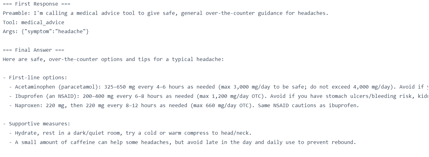 medical_advice) mit JSON-Schema definiert. - Ich hab 'ne Systemanweisung hinzugefügt, die dem Modell sagt, dass es vor jedem Tool-Aufruf 'ne einzeilige Meldung „