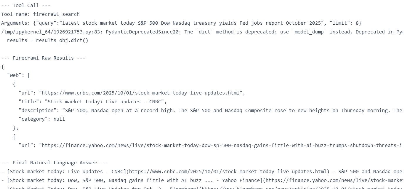 Es hat die Firecrawl-Suche ausgewählt und damit die endgültige Antwort im Markdown-Format erstellt.