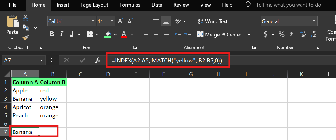 =INDEX(A2:A5, MATCH(“yellow”, B2:B5,0))