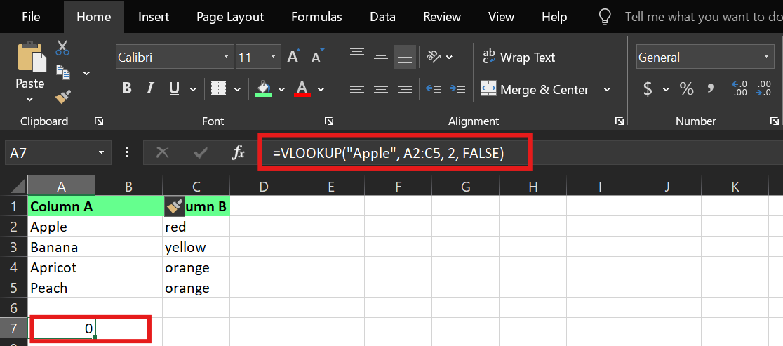 =VLOOKUP("Apple", A2:C5, 2, FALSE)