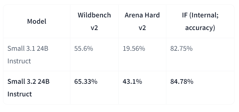 Mistral-Small-3.2-24B-Instruct-2506 es una mejora significativa con respecto a Mistral-Small-3.1-24B-Instruct-2503, ya que mejora el seguimiento de instrucciones, reduce los errores de repetición y proporciona una plantilla de llamada de funciones más robusta, todo ello mientras mantiene o mejora ligeramente las capacidades generales. Como modelo de instrucción de 24B parámetros, es ampliamente accesible en todas las plataformas, incluidos los mercados de AWS, donde destaca por su mayor cumplimiento de las instrucciones.