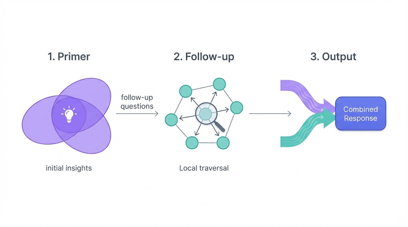 El proceso tiene tres fases. En primer lugar, la fase inicial compara la consulta con los resúmenes de la comunidad más relevantes desde el punto de vista semántico y genera una respuesta inicial junto con preguntas de seguimiento. En segundo lugar, la fase de seguimiento toma esas preguntas y aplica la búsqueda local para profundizar en áreas específicas, produciendo respuestas intermedias y seguimientos más específicos. En tercer lugar, la fase de salida combina todo en resultados clasificados que equilibran la información global con los detalles locales.