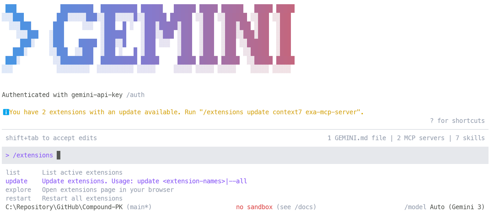 Use Gemini directly in the terminal with tools, MCP servers, and repo instructions |