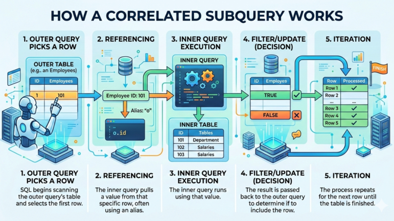 To query such tables, SQL allows you to do correlated subqueries, which define a specific relationship where the inner query depends on the values of the outer query. While a standard subquery runs once and finishes, a correlated subquery is dynamic, executing repeatedly for every single row the main query evaluates.