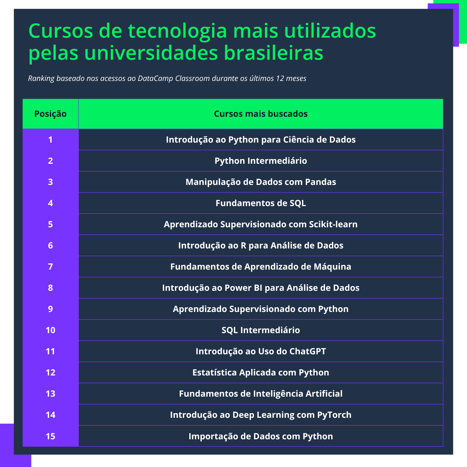 Abaixo, confira o ranking com os cursos de tecnologia, dados e IA da DataCamp mais populares nas salas de aula de universidades do Brasil nos últimos doze meses: