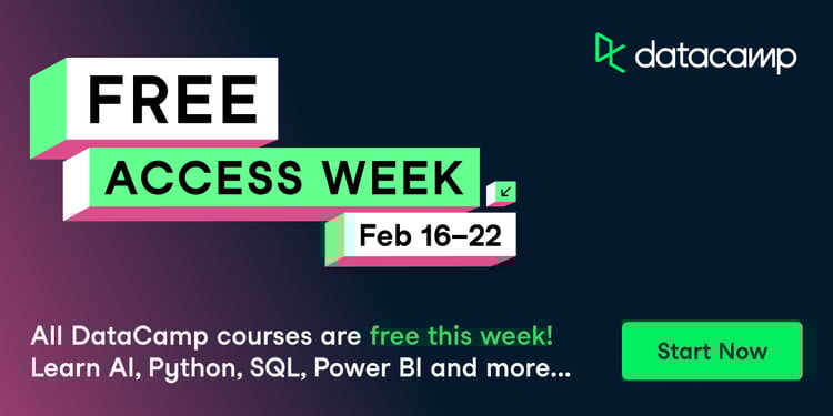 Free Week gives unlimited week-long access to everything DataCamp Premium offers and is available to individuals anywhere, anytime. So if you’re looking to learn or develop your programming skills, you can get started for free.