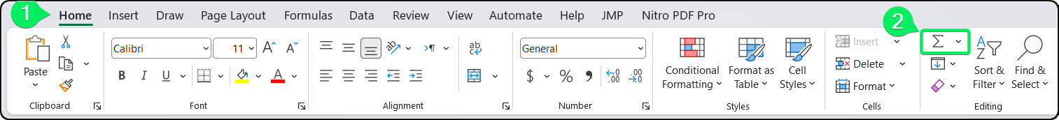AutoSum lives in two places on the ribbon. On the Home tab, look for the Editing group on the far right. You'll see the Greek letter Sigma (Σ) with a small dropdown arrow. This is AutoSum.