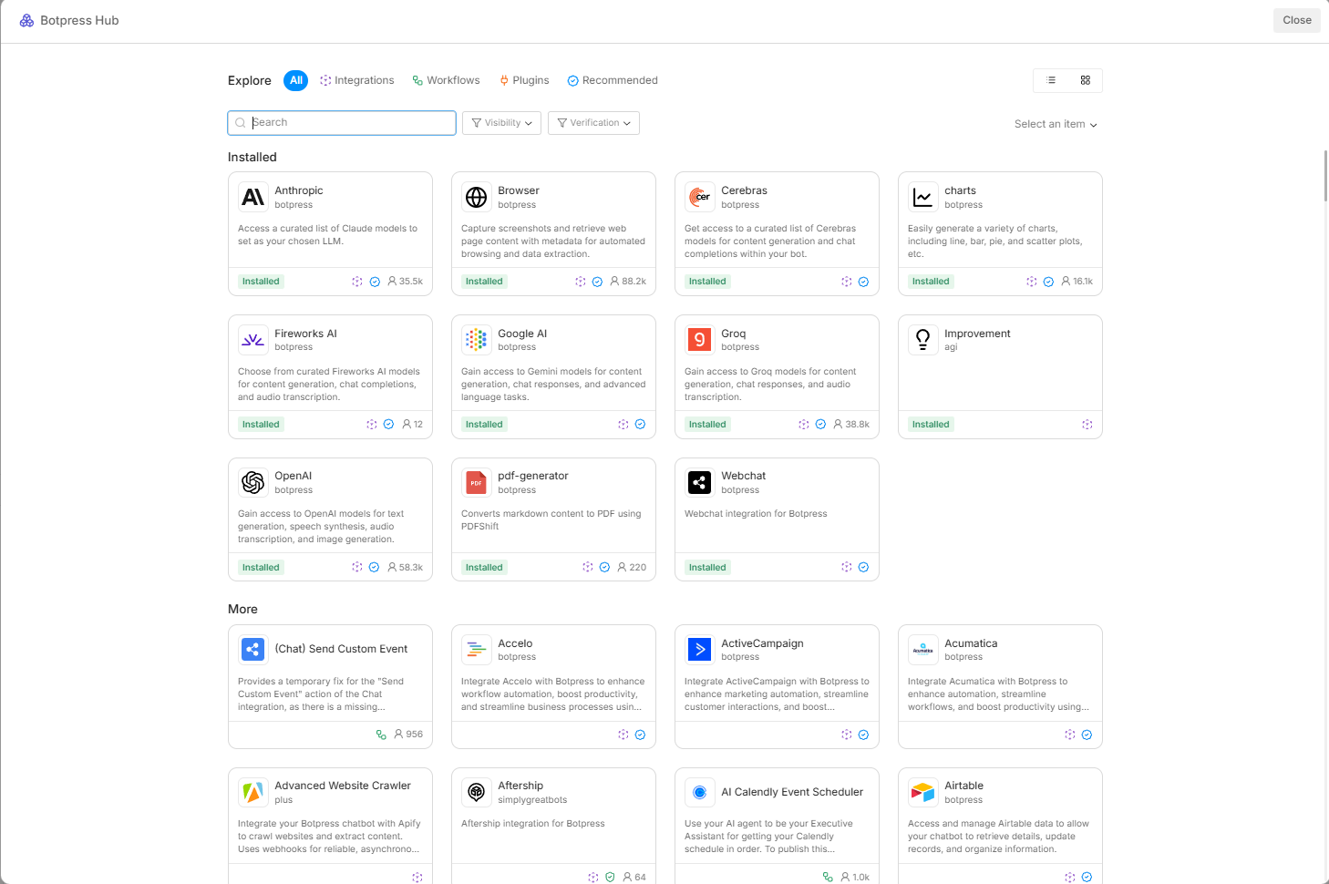 Botpress bots become powerful when they connect to external services. The Botpress Hub provides pre-built integrations for common tools, and you can build custom integrations for proprietary systems.