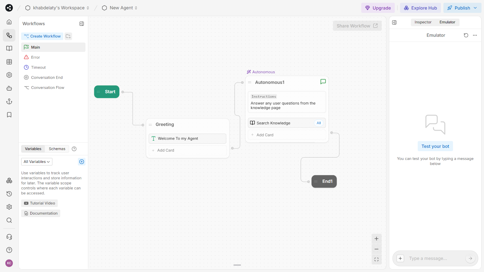 Workflows organize your bot's logic into manageable segments. The main workflow handles the primary conversation flow. Sub-workflows handle specific tasks. This could be things like scheduling appointments or processing returns.
