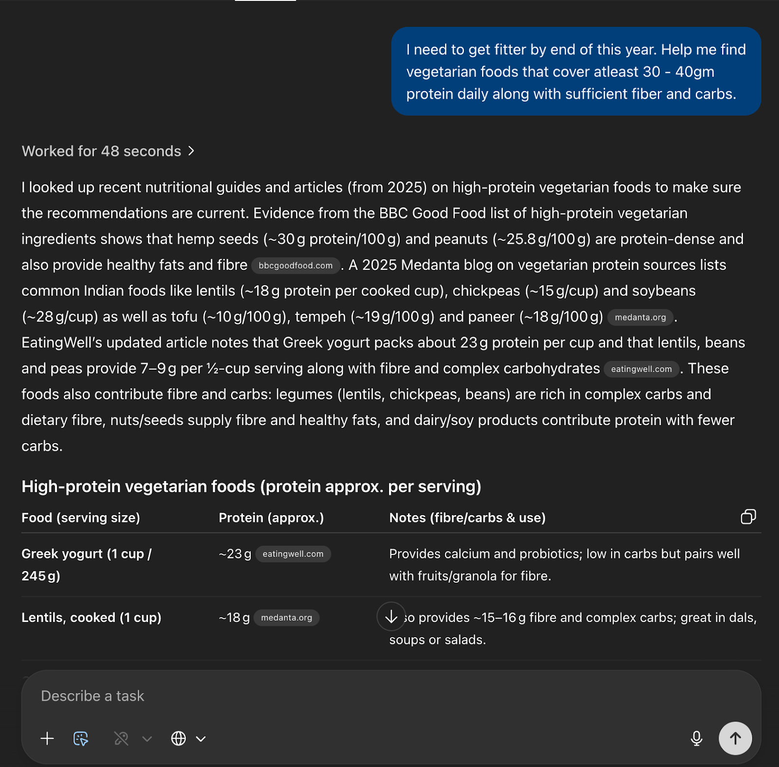 Atlas did well as a research copilot and pulled up-to-date sources (BBC Good Food, Medanta, EatingWell) and returned a clean table with per-serving protein and usage notes. In the next experiment, I tried adding some of these items to my shopping cart.