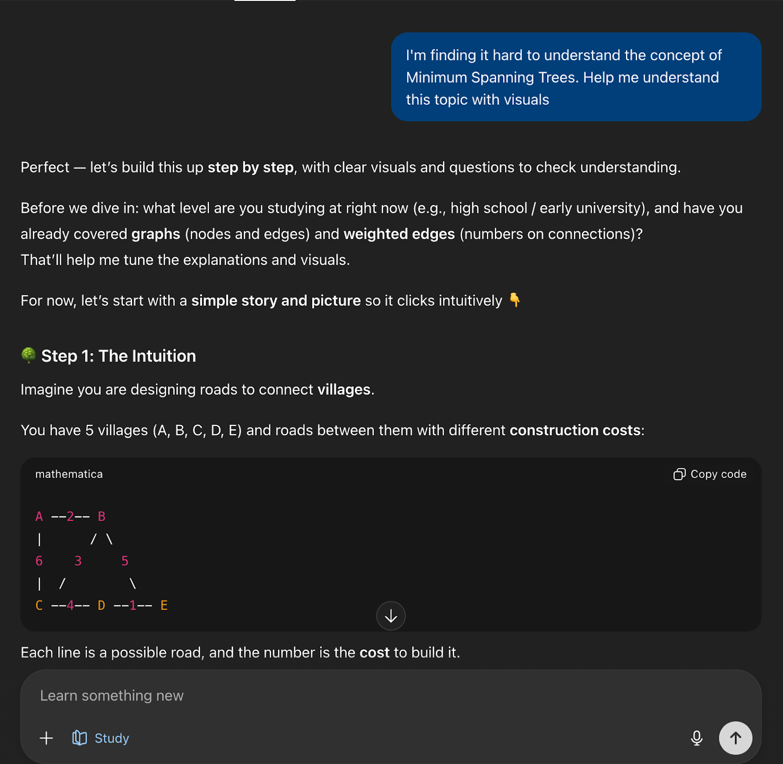 It generated the lesson step-by-step with inline visuals and diagrams of a sample graph. It even included mini-quizzes and reflection questions along with copyable code blocks for experimenting.
