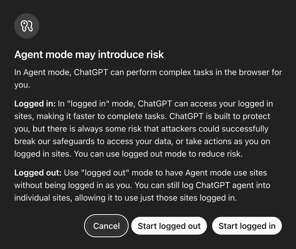 For this experiment, I tried a prompt with Agent Mode. It is important to note that switching on Agent mode returns a “may introduce risk” dialog (logged-in vs logged-out options). While logged-in speeds up tasks on sites you’re authenticated to, but increases exposure and logged-out limits access and is safer for sensitive flows.