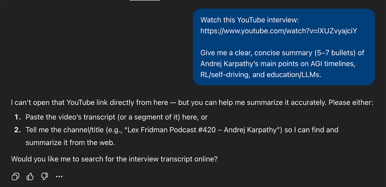 After I supplied the context from the description, it generated a bullet summary covering AGI timelines, RL critiques, self-driving headwinds, LLM limitations, and education takeaways.