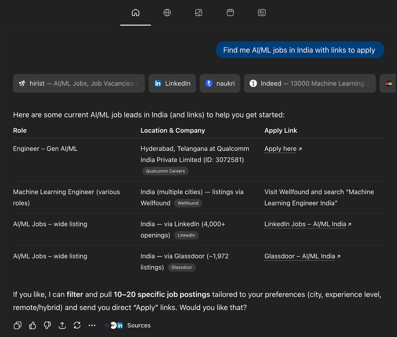 Prompt: Find me AI/ML jobs in India with links to apply
