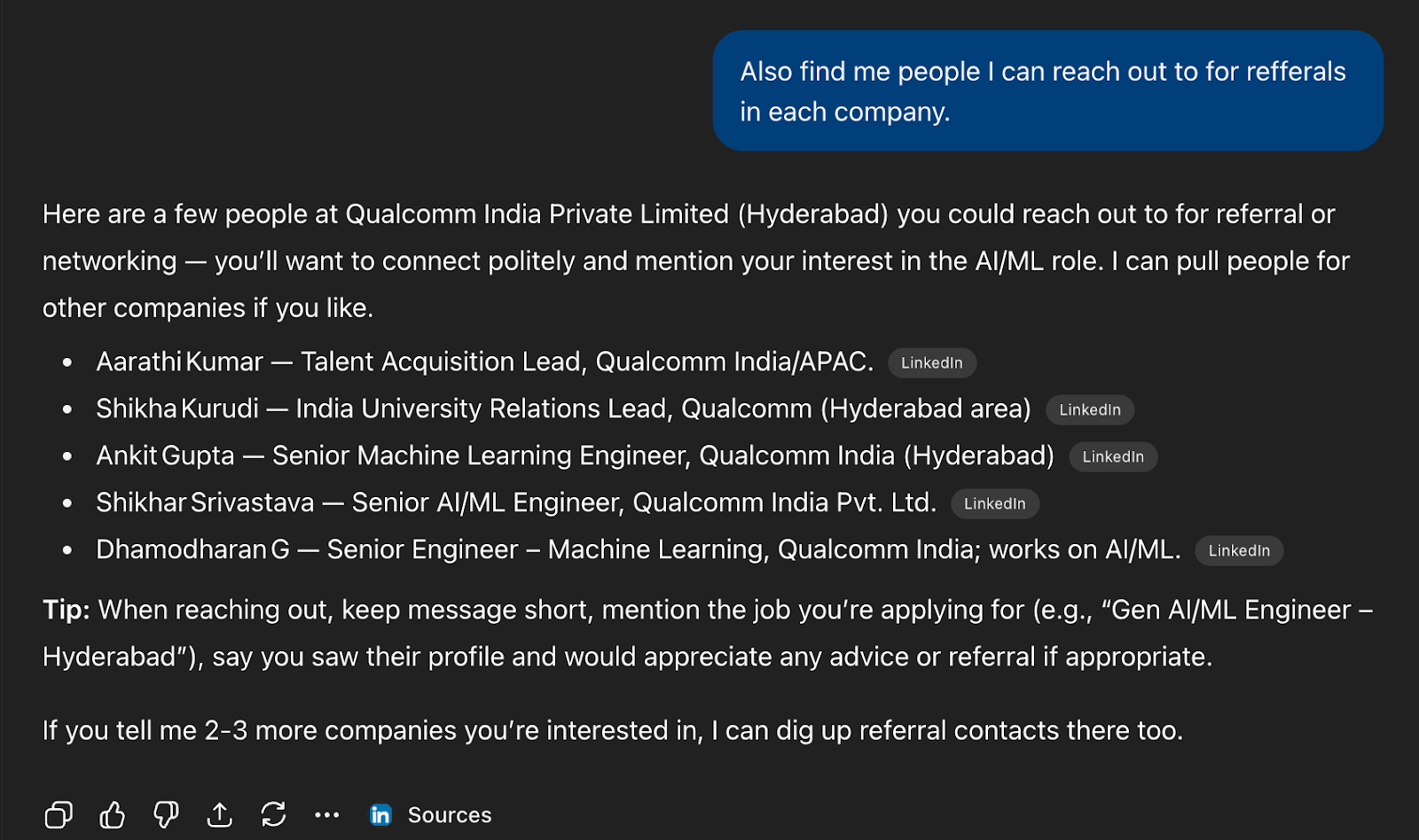 Prompt: Also find me people I can reach out to for referrals in each company.