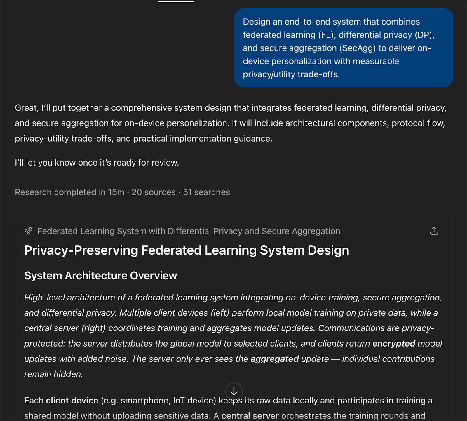 The draft included an architecture overview, protocol flow, threat model, privacy accounting (ε/δ discussion), metrics, and a deployment checklist. It cited papers, specs, and blog posts as it went, so I could jump directly into sources while the summary was still generating.