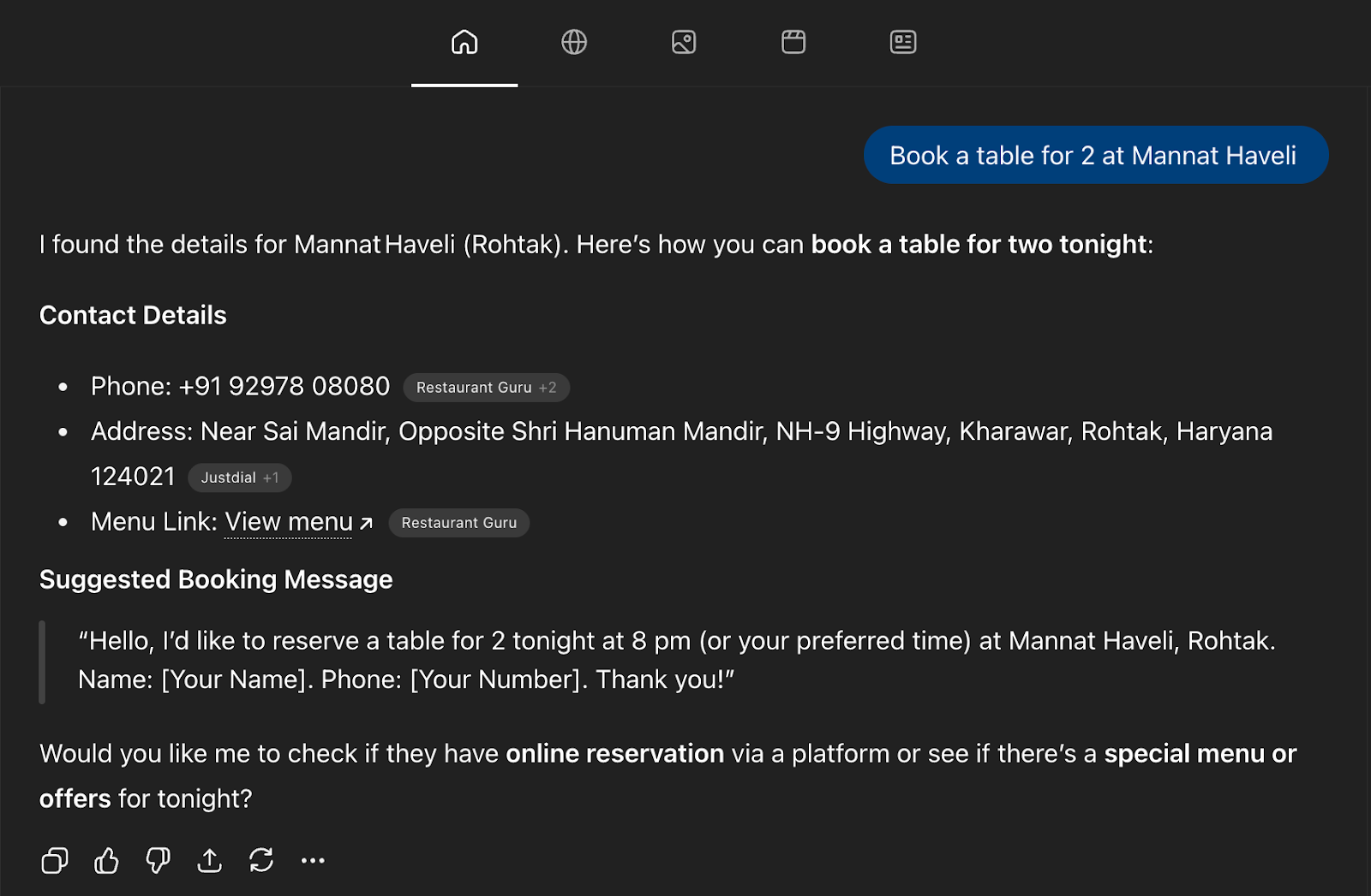 I even asked it to book a table for two to check its capabilities of addressing complex tasks. Here is what I got: