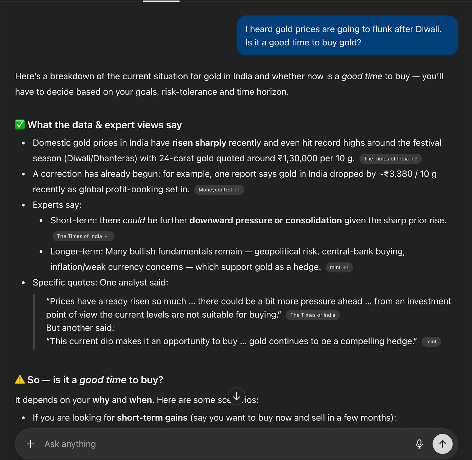 Prompt: I heard gold prices are going to flunk after Diwali. Is it a good time to buy gold?