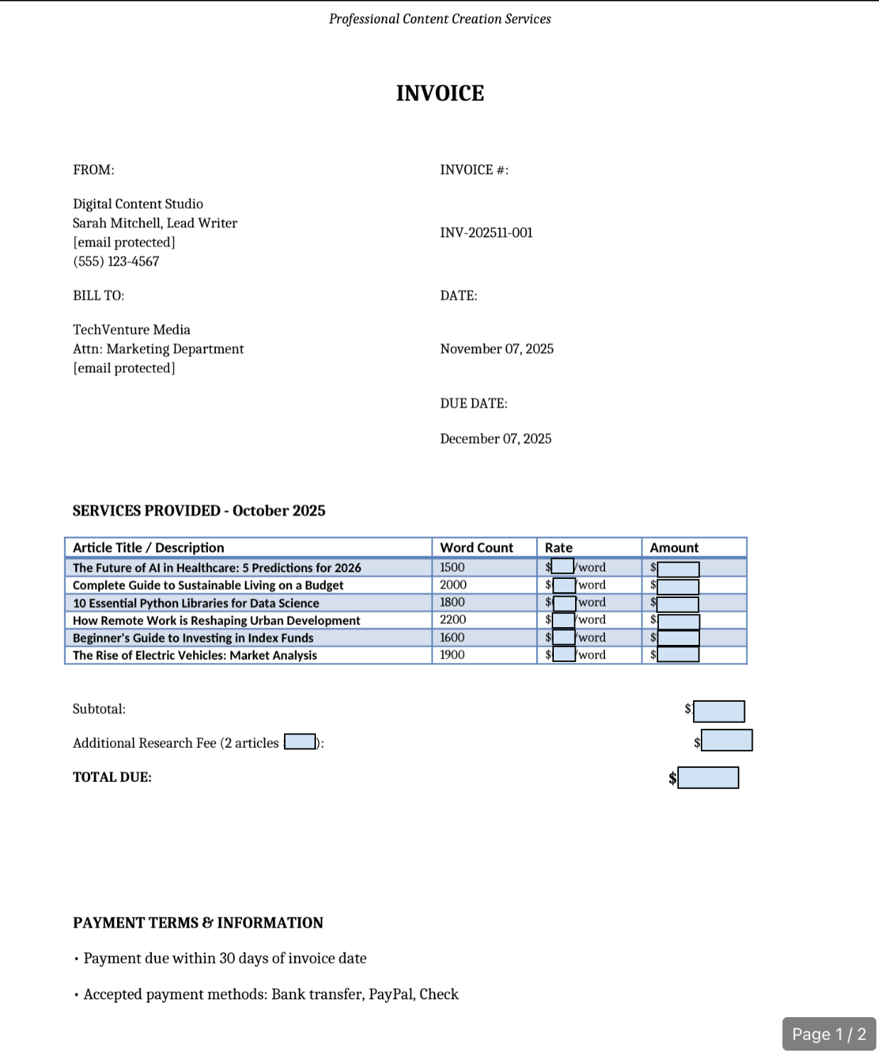 description: "Generate monthly invoices for written content from simple line items. Produces a branded PDF or editable DOCX/RTF invoice and, optionally, a one-page timesheet if article titles/links are provided."