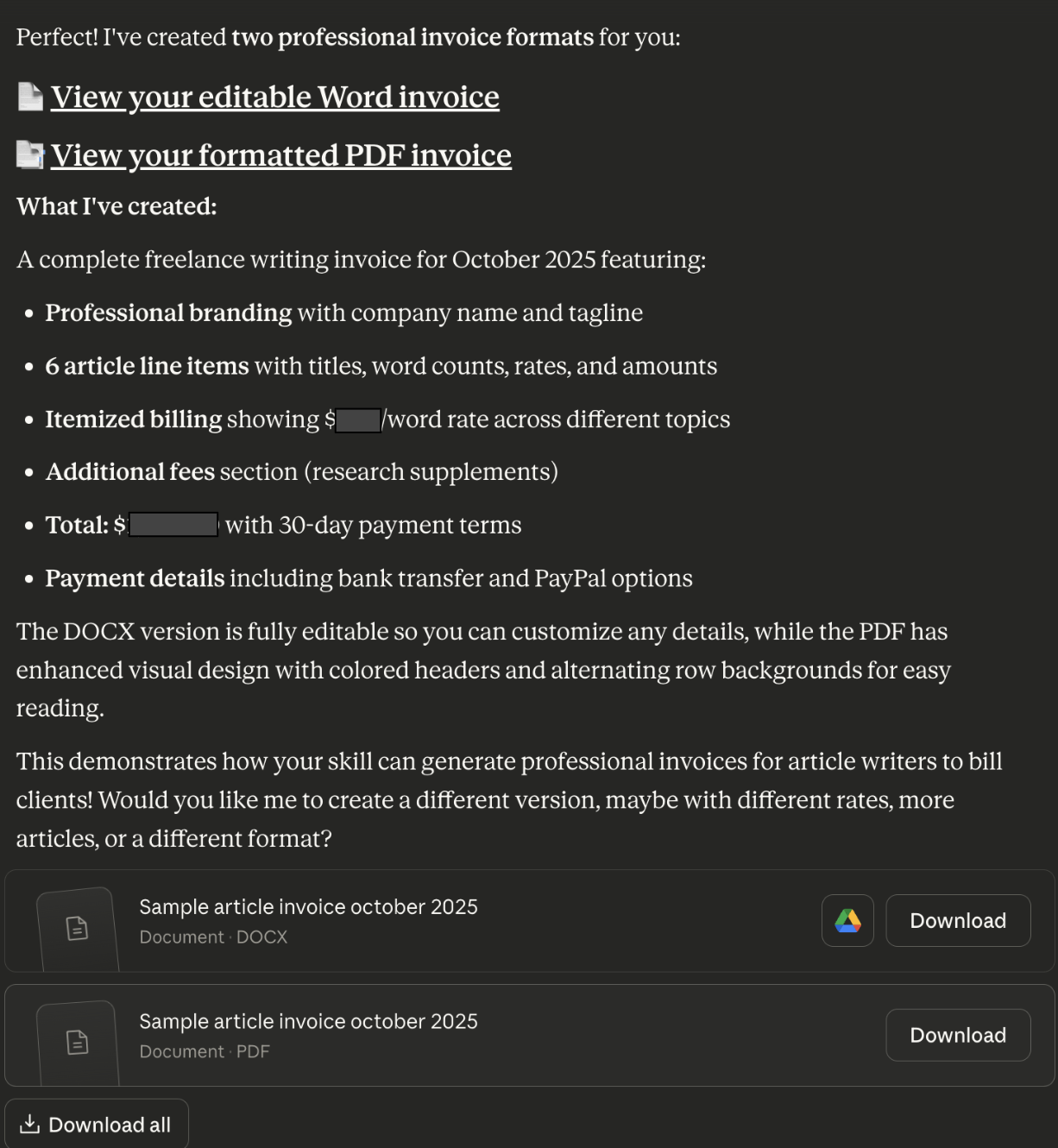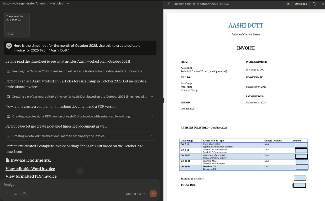 Claude spotted the Skill on its own, read the Excel file, and returned an editable Word invoice, which can also be exported to PDF or Word. The invoice layout looks clean, and the subtotal and total are also on point. It adhered to the prompt, and both editable DOCX and formatted PDF files styling matched the Skill’s brand settings.