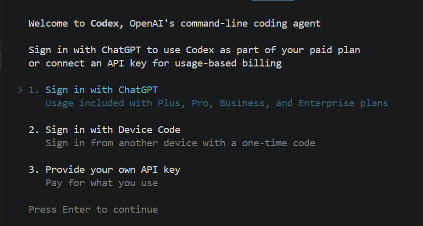 The next step will be to authenticate your account, so the tool knows who you are. You can verify that everything is installed correctly and launch the agent for the very first time just by typing codex into your terminal. It will show you something like this: