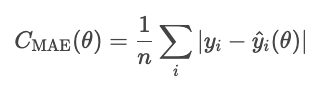 The MAE treats all deviations equally, so it is not as affected by outliers as other methods we'll see, such as the MSE. However, the absolute error is awkward mathematically and makes gradient-based optimization more difficult.