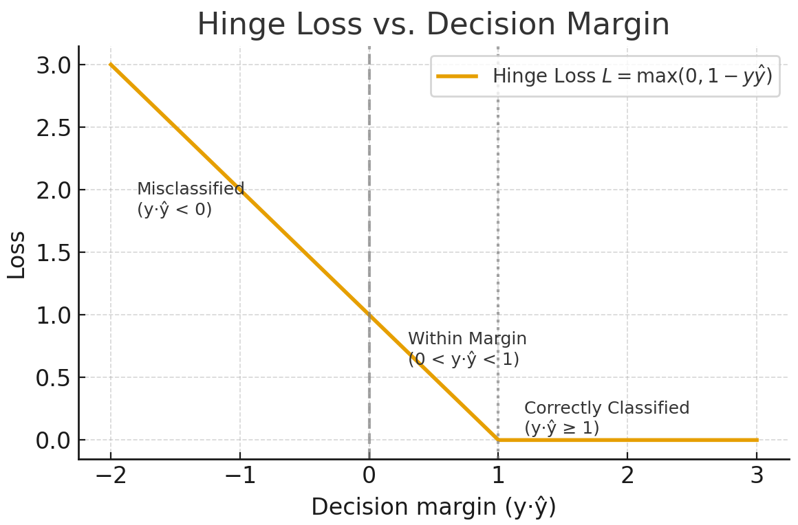 The hinge loss is mostly used for max-margin classification, as in support vector machines (SVMs). The goal is to classify confidently by keeping predictions far from the decision boundary.