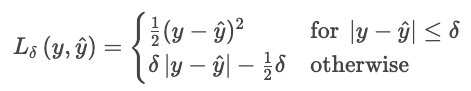 The Huber loss is less sensitive to outliers in the data than the MSE (or RMSE). It combines MAE and MSE, and controls the transition with a parameter δ.