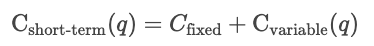 In the short run, at least one input, such as capital or plant size, is held constant, and other inputs vary. Short-run costs measure how efficiently a firm operates with its current setup. So, for a given quantity q, the cost in the short term is the sum of the fixed costs and the variable costs dependent on quantity.
