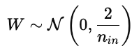 - He initialization. Adjusts the variance for ReLU activations, which zero out negative values. The weights are drawn from a normal distribution with a specified variance:
