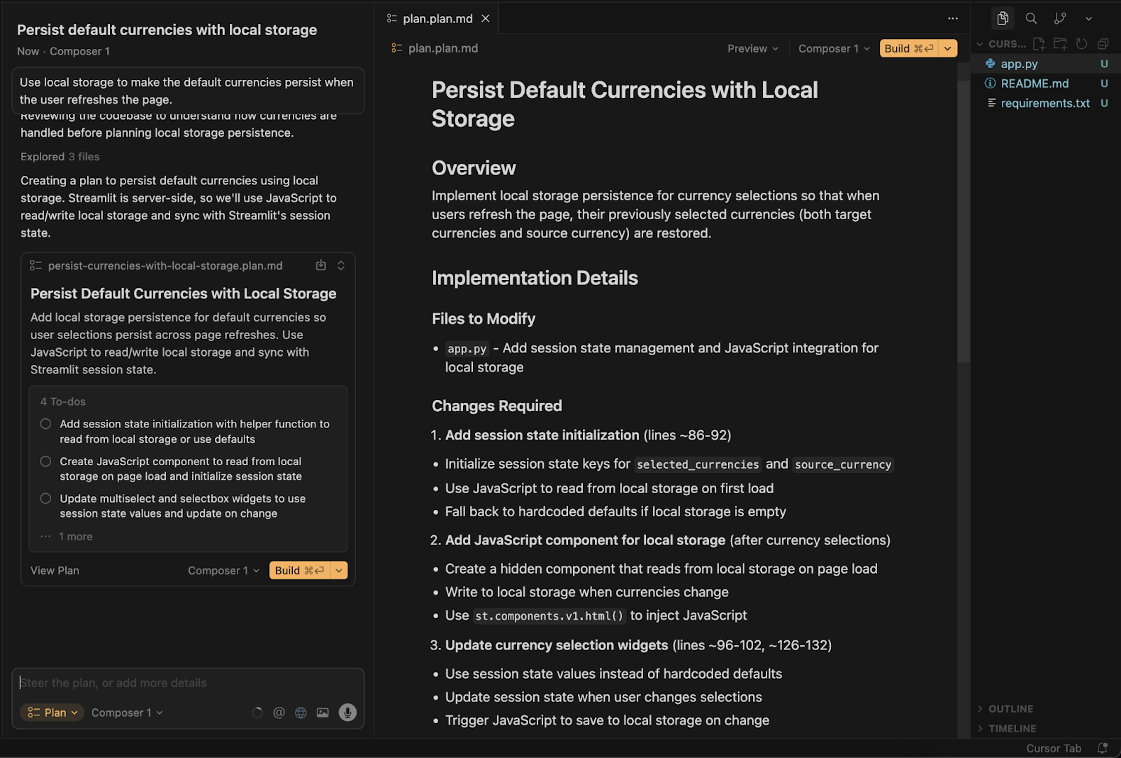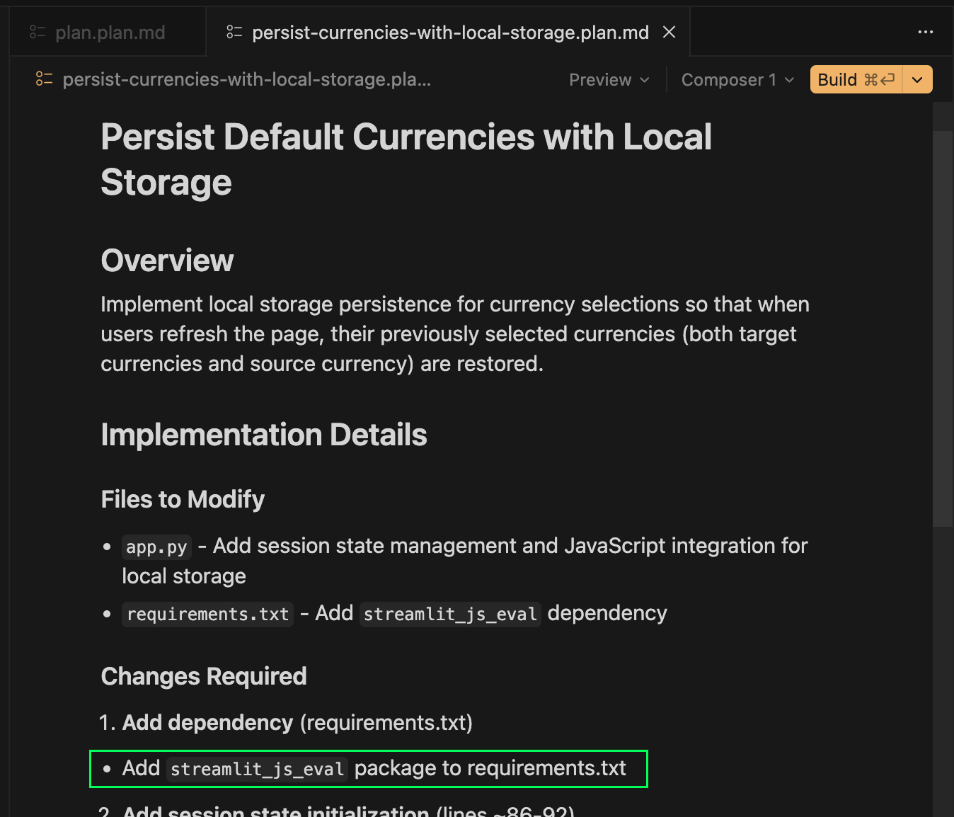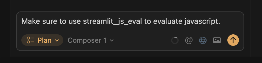 Say I want to use the streamlit_js_eval library to evaluate JavaScript code. This was something the GPT-5 Codex solution had used and that felt more robust than Composer’s solution. We can ask the agent to modify the plan accordingly:
