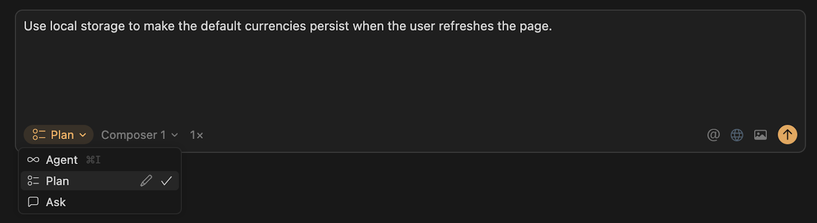 Instead of having the agent directly propose code changes, we can use the “Plan” mode to first work on an implementation plan. This makes it possible to iterate on the plan and make sure it is implementing what we want before making any changes to the code.