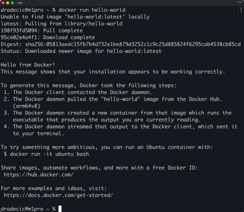 The docker run hello-world command does one thing well: It proves your Docker installation works.