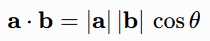 a · b = |a| |b| cos θ. Positive for acute angles, zero at 90°, negative for obtuse angles.